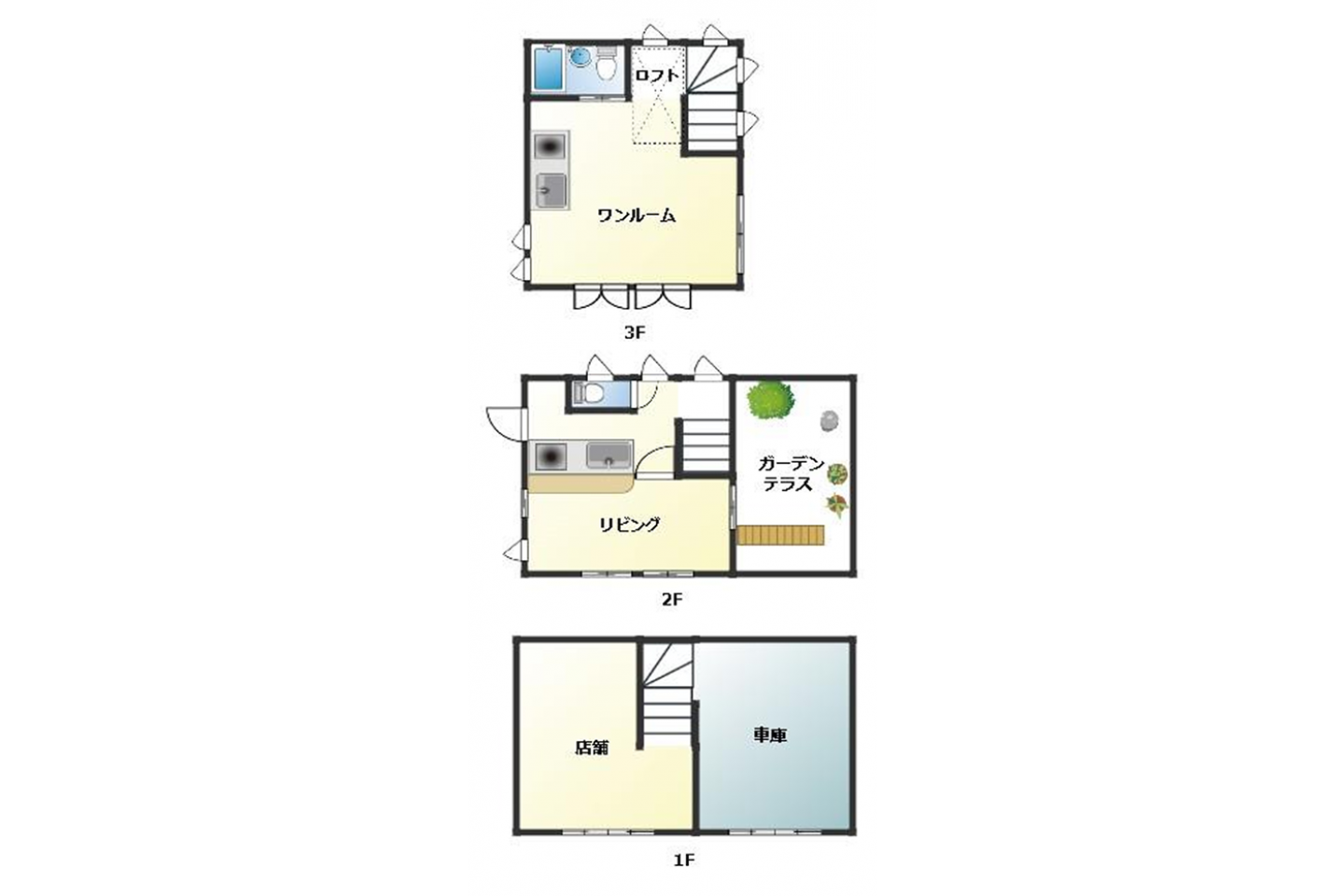 | 備考欄 | ◎ 1F : 店舗+車庫 ◎ 2F : リビング+ガーデンテラス ◎ 3F ; ワンルーム ◎ 都市計画 : 市街化区域 ◎ 準防火地域・第3種高度地区 ◎ 電気・ガス・上下水道 |