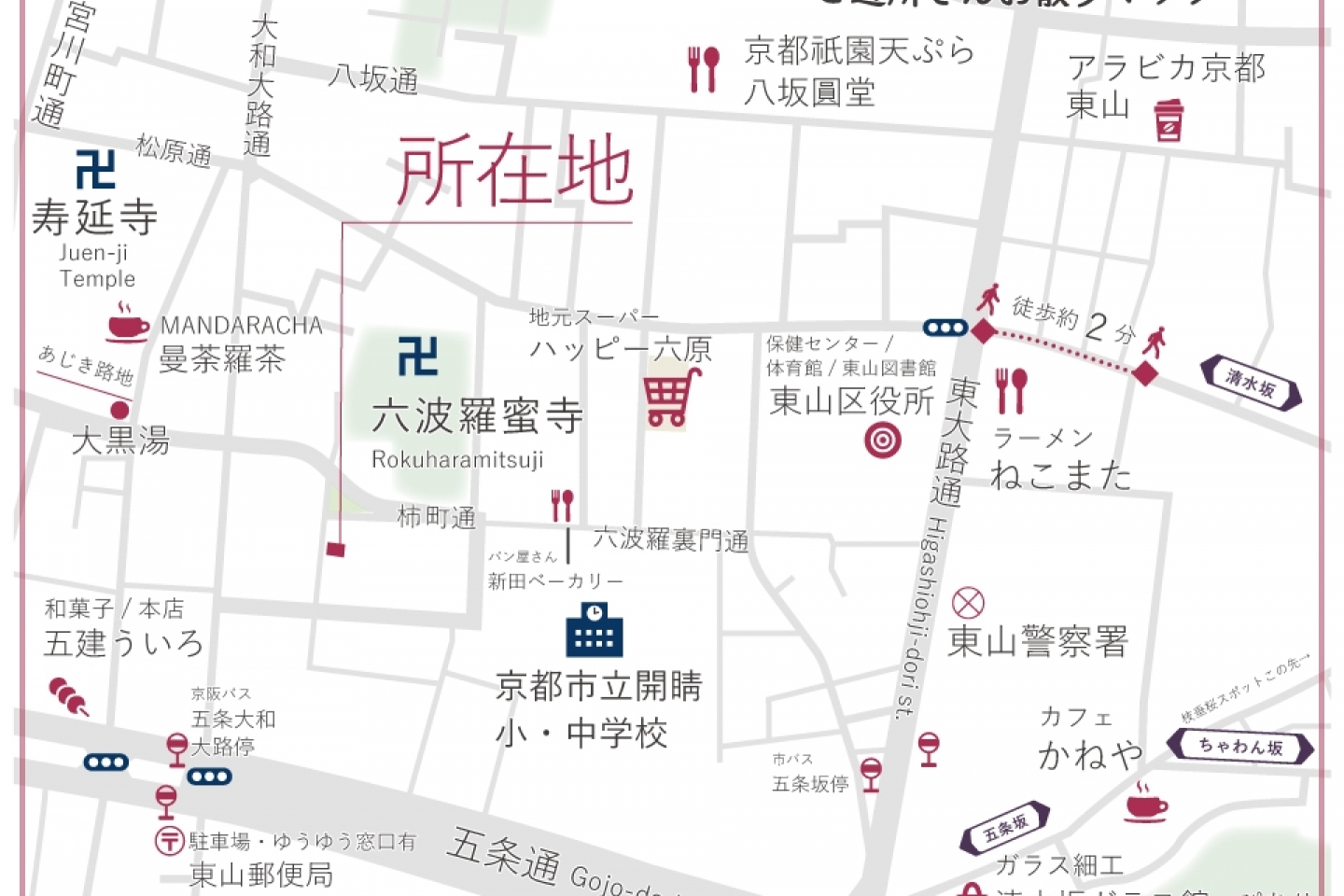 | 交通機関 | 京阪本線「清水五条」駅徒歩6分 京阪本線「祇園四条」駅徒歩12分 京都市営地下鉄烏丸線「五条」駅徒歩16分 京都市バス「五条坂停」駅徒歩7分 |