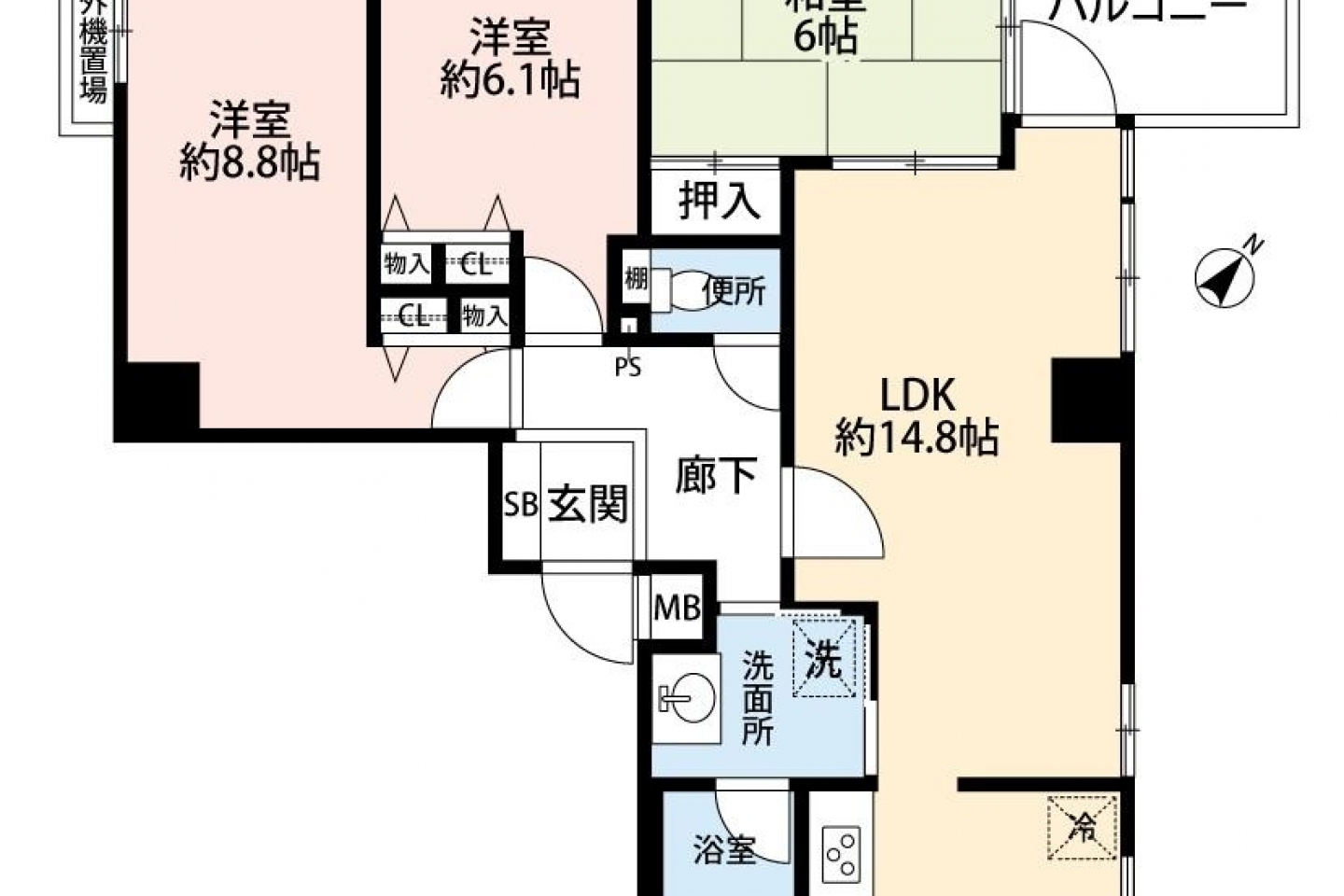 | 区分 | LDK:14.80畳、和:6.00畳、洋:6.10畳、洋:8.80畳 |