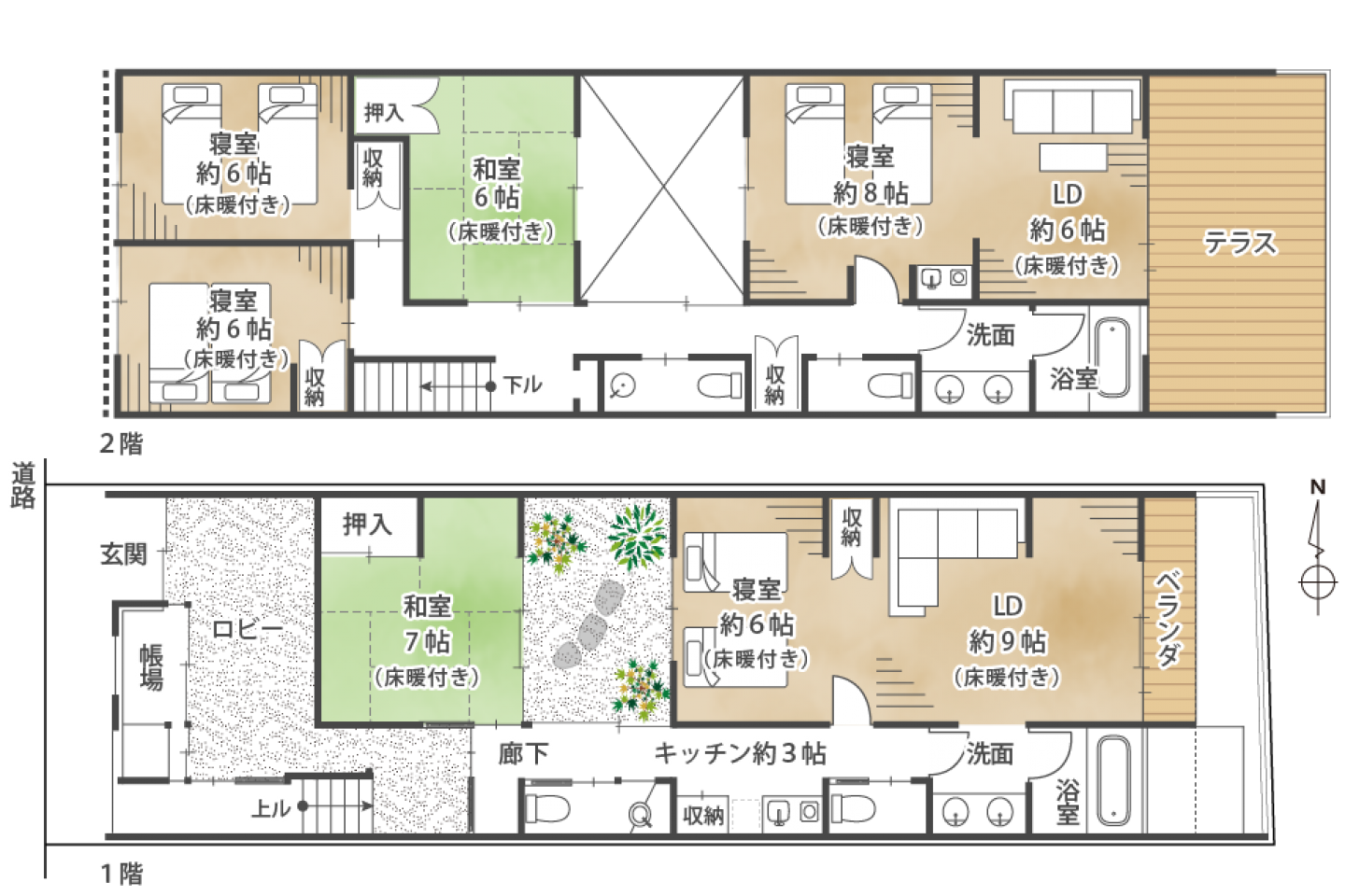 | 設備 | 専用浴室(トイレ別) / 専用トイレ(水洗) / 洗面(浴室別) / 専用台所 / シャワー:あり / 独立キッチン / キッチン型:II型キッチン / バルコニー / 中庭 / 床暖房 |