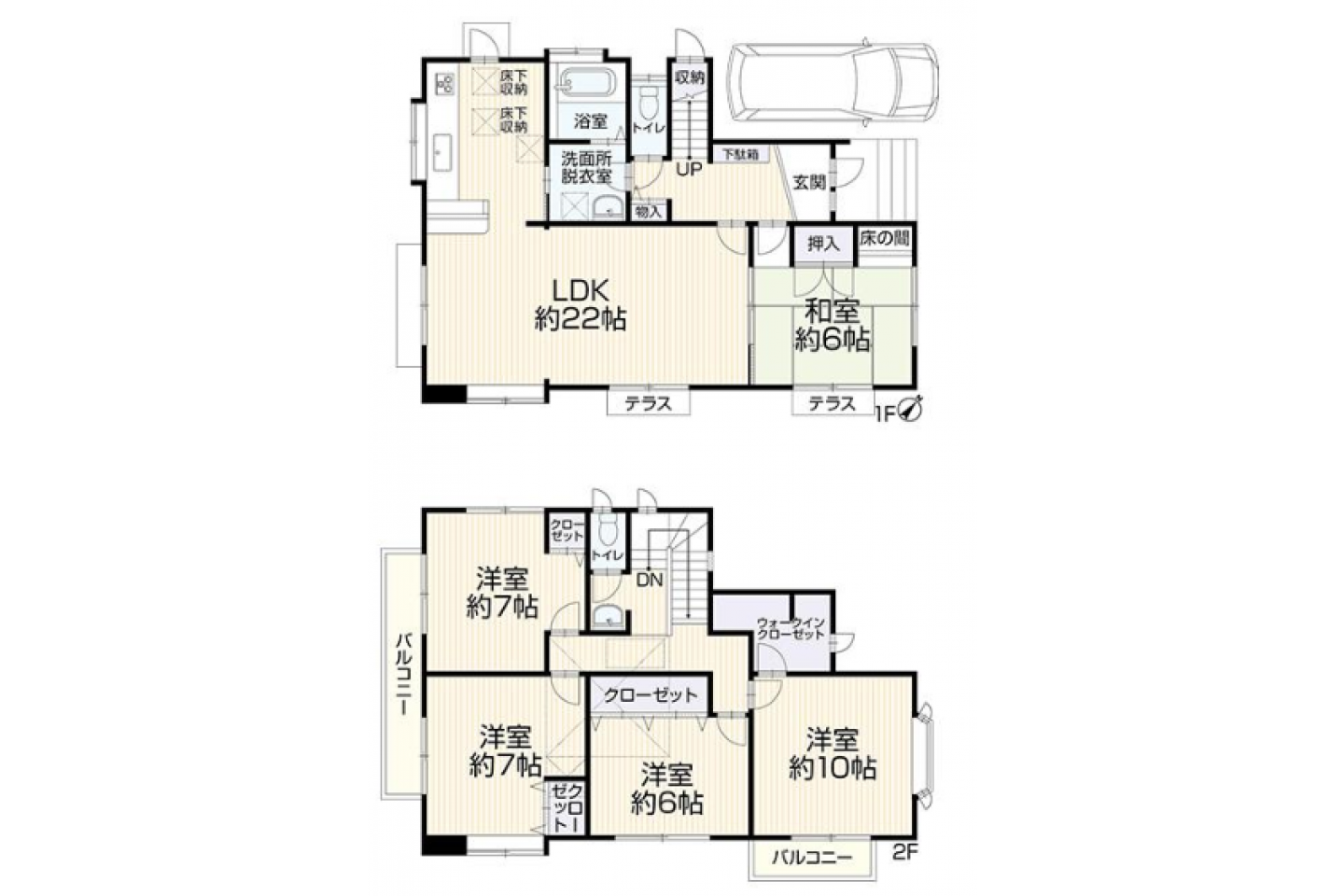 | 区分 | LDK:22.00畳、和:6.00畳、洋:7.00畳、洋:7.00畳、洋:6.00畳、洋:10.00畳 |
